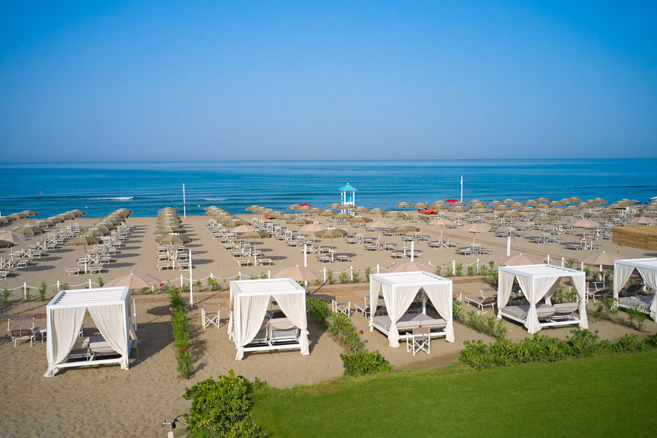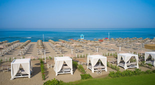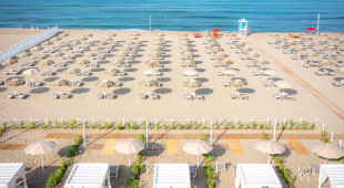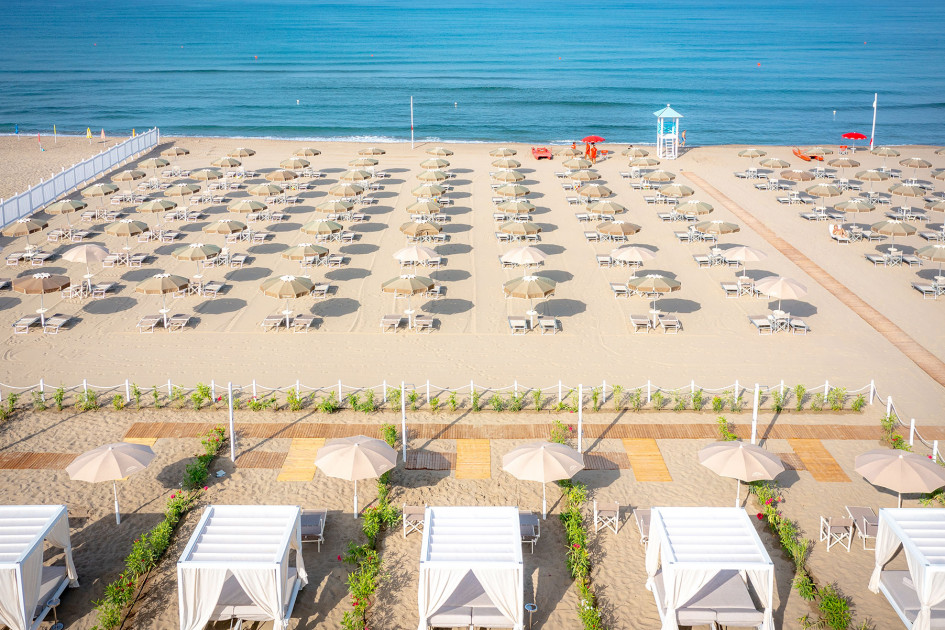 Собствен, пясъчен плаж на 250 метра от хотела (през борова гора). Чадъри и шезлонги на плажа се предоставят в периода от юни до септември. На първи и втори ред шезлонги и чадъри са срещу заплащане и изискват предварителна резервация, след трети ред са безплатни.