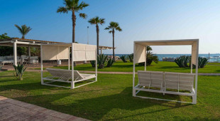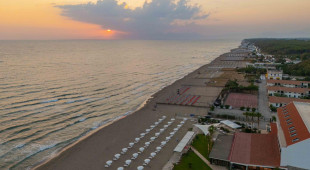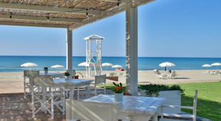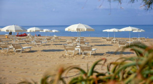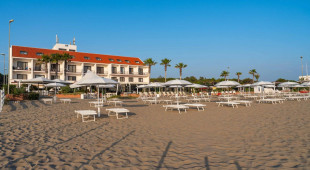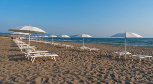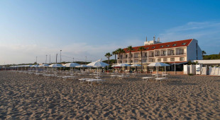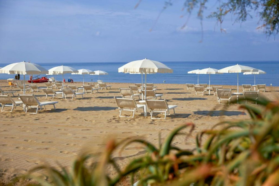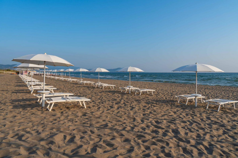 Собствен, пясъчен.Чадъри и шезлонги на плажа се предоставят в периода от юни до септември. На първи и втори ред шезлонги и чадъри са срещу заплащане и изискват предварителна резервация, след трети ред са безплатни.