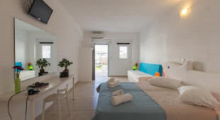 Черният пясъчен плаж на Периволос се намира на минута от хотела. Има зони с доплащане за чадъри шезлонги, и такива само с консумация в съответния ресторант или бар.